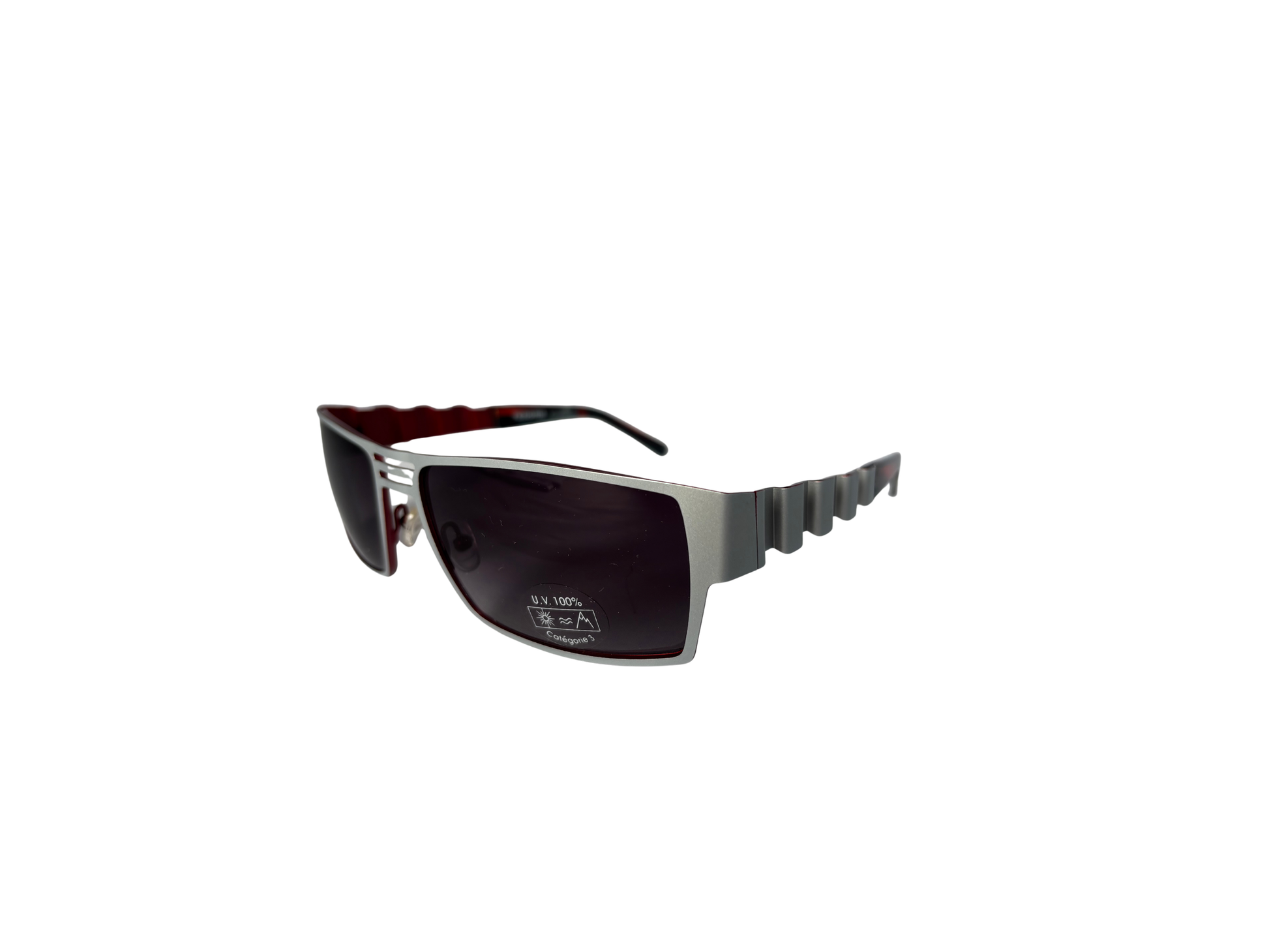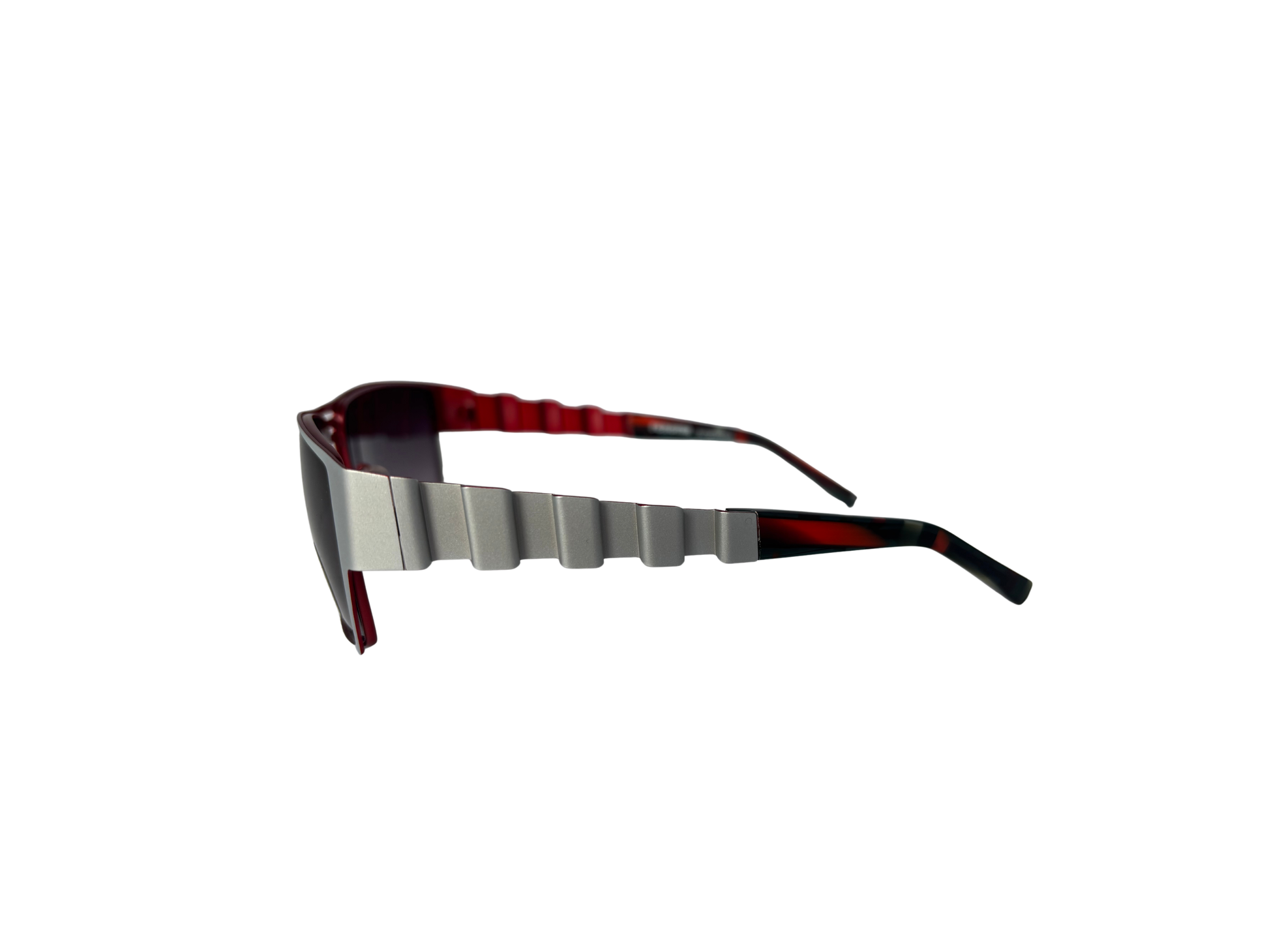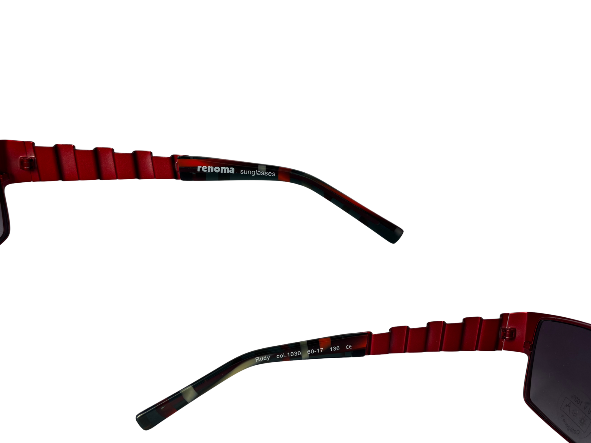 Renoma sunglasses with a sculptural design typical of the 90s. A bold angular line, textured temples with a deep red/tortoiseshell contrast: a striking, graphic piece, conceived as a fashion accessory in its own right. Lightweight construction despite its size, very comfortable to wear.